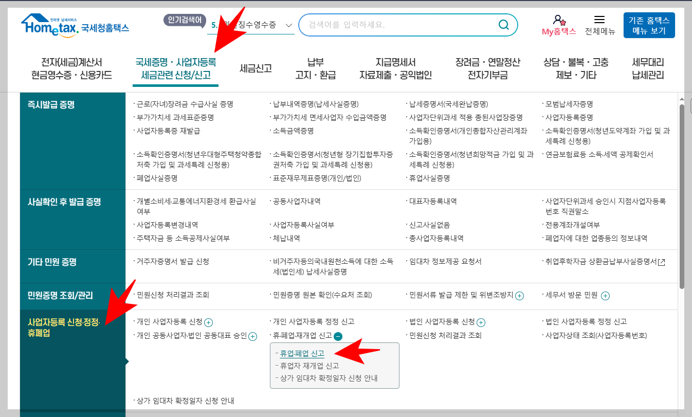 국세청 홈택스에서 로그인을 하시고 상단의 '국세증명, 사업자등록, 세금 관련 신청/신고' 탭에서 '휴폐업, 재개업신고'를 선택한 뒤 '휴업, 폐업신고'를 눌러서 진행하시면 됩니다.