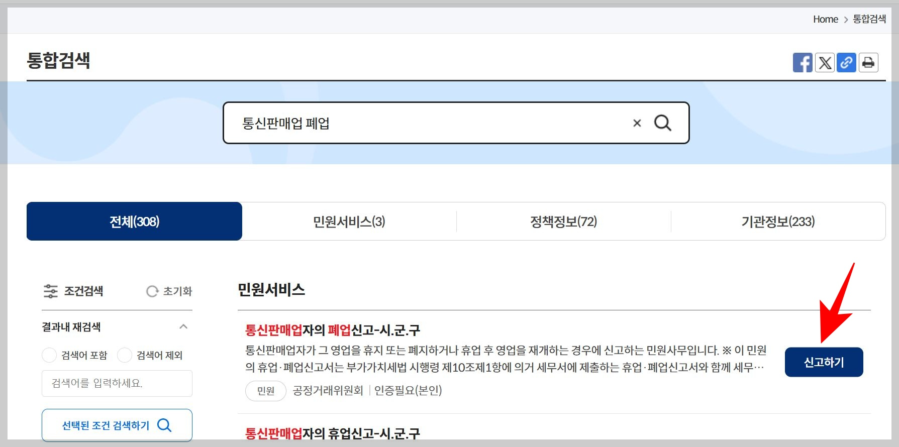 정부24 사이트 첫 화면에서 '통신판매업 폐업'을 검색합니다. 위 바로가기 단추를 누르면 바로 폐업 신고하는 창으로 갑니다. 검색 후 '신고하기'를 클릭하세요.
