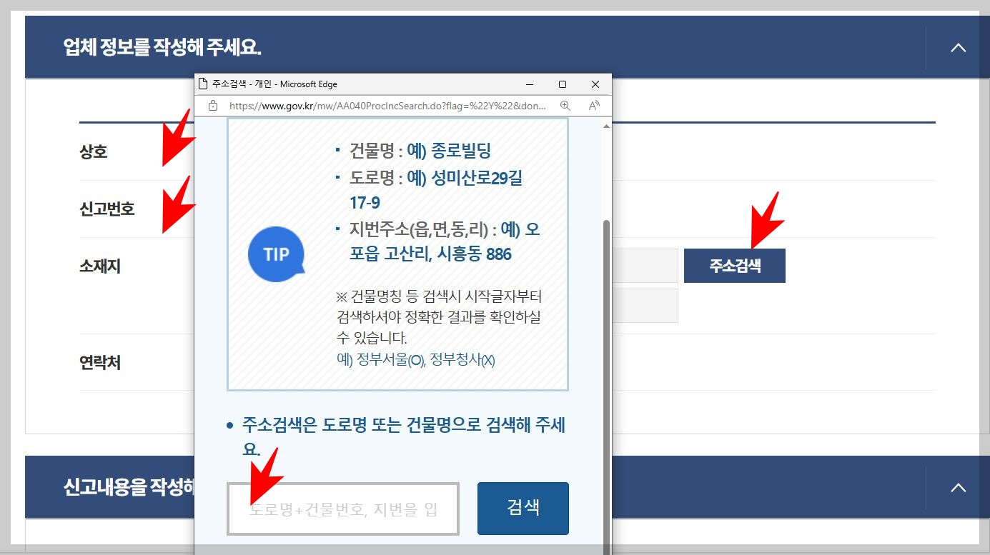 상호명 등 업체 정보를 넣어줍니다. 주소도 검색해서 넣어주시고요.