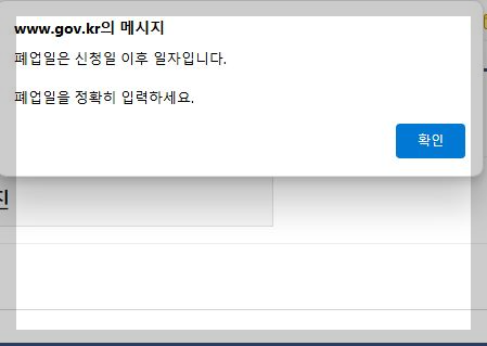 신고 내용을 작성해 주는데, 홈택스에서 사업자 상태 조회를 한 뒤 폐업일 을 알아내어서 적었어요. 그랬더니 폐업일을 신청일 이후로 하라는 메시지가 뜨네요. 어쩔 수 없이 글 작성일 다음날로 적었습니다.