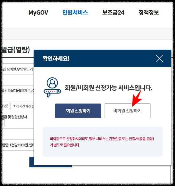 4. 정부24 사이트에 회원가입이 되어있거나 공인인증서가 있는 경우엔 '회원신청하기'를 클릭하시고, 1회성으로 열람을 원할 경우엔 비회원 신청하기를 선택해도 무방합니다. 비회원 신청하기로 해보겠습니다. 개인정보 동의에 체크를 합니다.