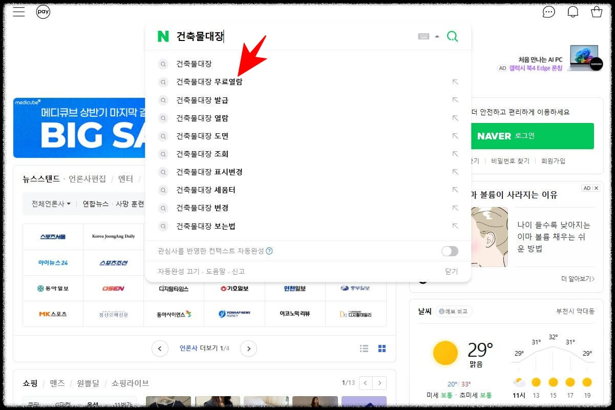 1. 검색창에 정부24, 혹은 건축물대장을 적으면 아래 연관검색어가 나옵니다. 무료열람을 선택하세요.