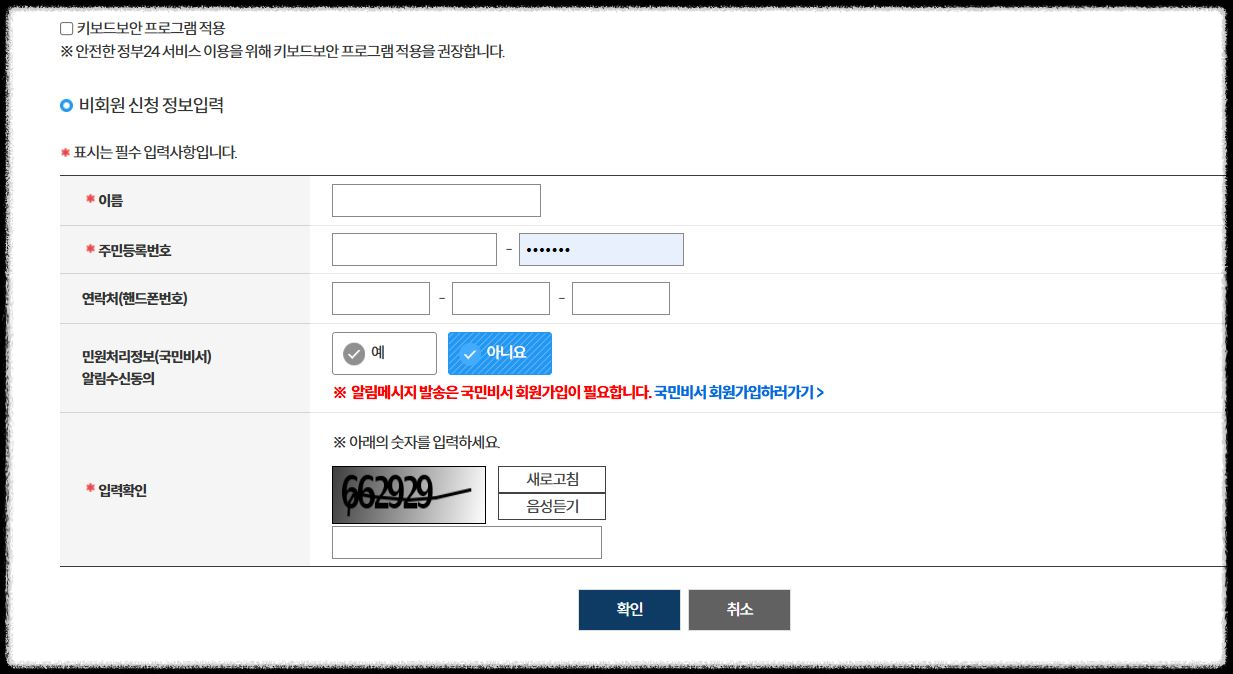 4. 그러면 '회원 신청하기'와 '비회원 신청하기' 버튼이 보입니다. 인증서 없는 경우, 혹은 인증 없이 하고 싶은 경우엔 비회원 신청하기를 누릅니다. 비회원 신청하기를 해보겠습니다.