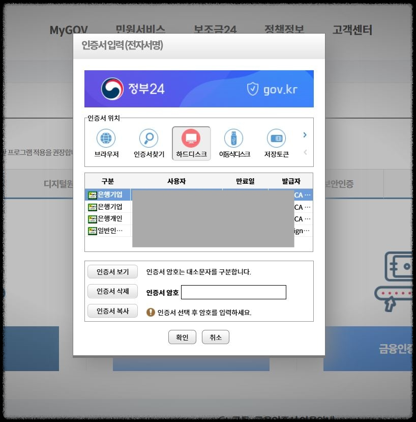 9. PC에 공인인증서가 깔려 있는 경우엔, 인증서로 인증을 합니다. 저는 인증서로 주민등록등본을 발급받아 보겠습니다.