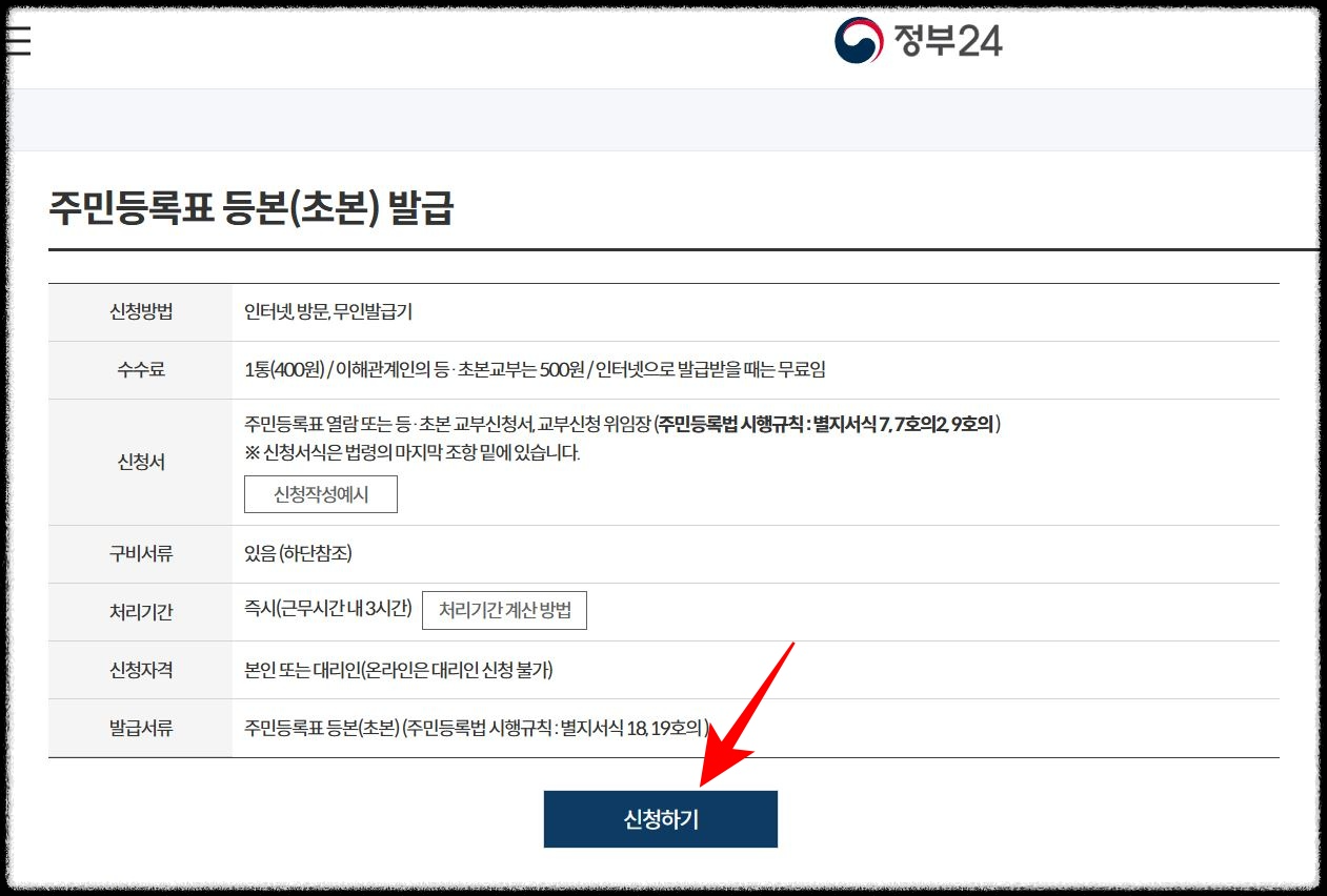 3. 그러면 바로 정부24 사이트 주민등록표 등본 발급 화면으로 넘어갑니다. '신청하기'를 누르세요.