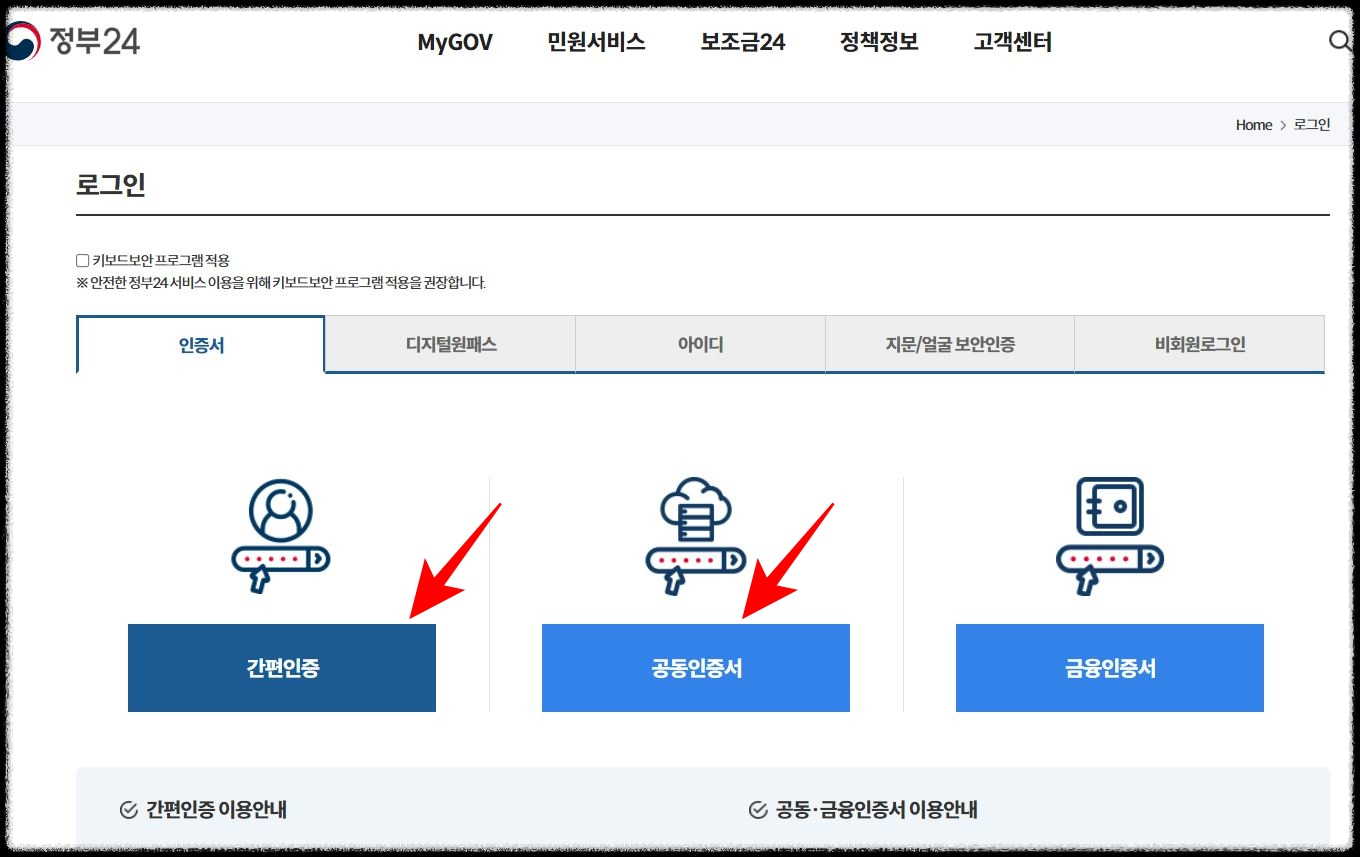 간편 인증을 선택할 경우, 네이버인증이나 카톡인증으로 진행하면 되고, PC에 인증서가 깔려있는 경우엔 '공동인증서'로 진행합니다.