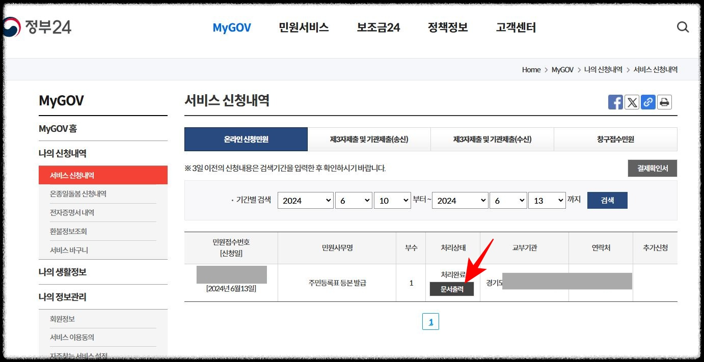 15. 위의 '신청하기'를 누르면 자동으로 화면이 바뀌는데, 혹시 다른 작업하다가 화면을 놓친 경우, MyGOV > 나의 서비스 > 서비스 신청내역에서 확인하세요. 문서출력 버튼을 누르고 출력하시면 됩니다.