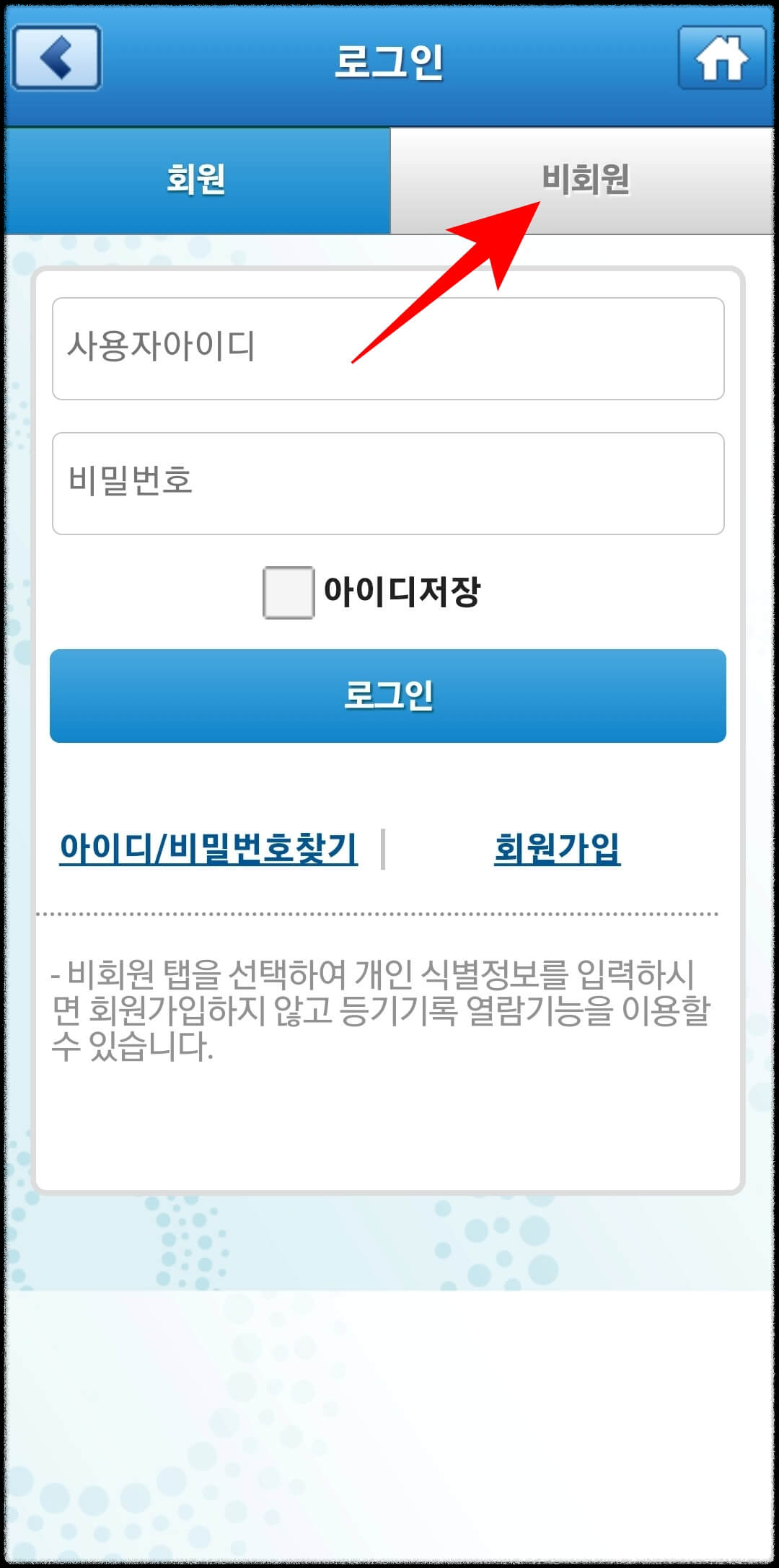2. 부동산열람 전자발급(전송)을 터치한 뒤, 회원 로그인 팝업이 뜨면 확인을 터치합니다.(1회성으로 열람할 경우, 비회원으로 진행해도 무방합니다. 회원가입 후 로그인을 하여 진행하면 등기부등본을 전자지갑으로 발송할 수 있습니다.)