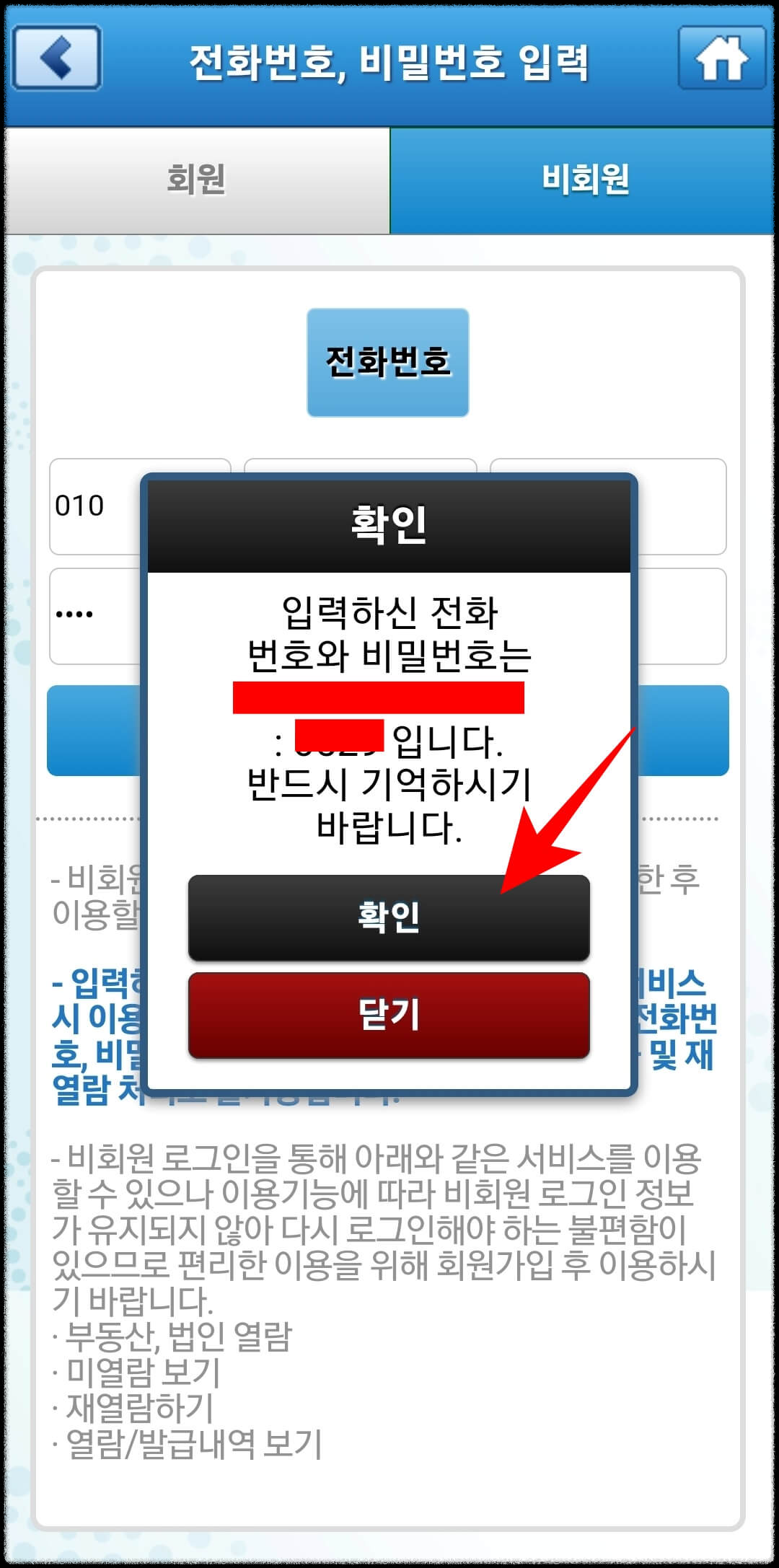 3. 1회성으로 발급 할 예정이므로 비회원 로그인을 해보겠습니다. 전화번호를 넣고 비밀번호 네 자리도 본인이 만들어서 넣습니다. 전화번호와 비밀번호는 꼭 기억하도록 합니다.