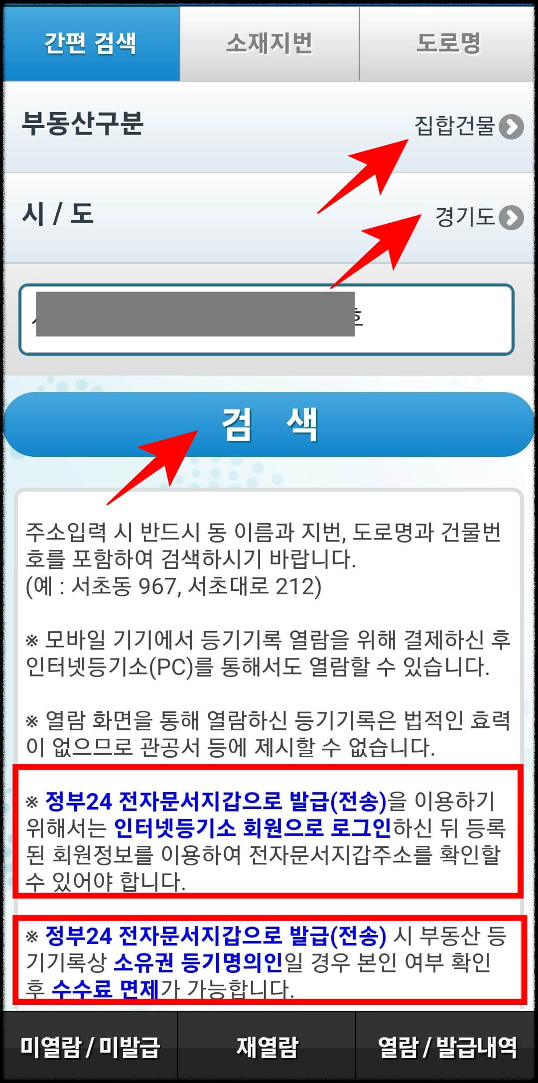 4. 부동산 구분을 터치합니다. 아파트나 빌라 오피스텔의 경우 집합 건물입니다. (대지, 전답, 임야 등을 열람할 경우 '토지'를 선택하고 일반주택, 다가구, 상가 등을 열람할 경우엔 '건물'을 선택합니다.) 그 다음 시도를 검색하고 주소를 적습니다. 검색된 부동산을 터치합니다.