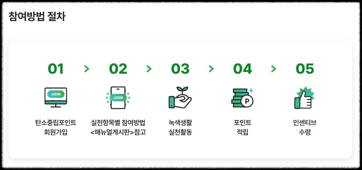 - 참여 방법: 탄소 중립 포인트 녹색 생활 누리집 가입 후 실천, 전자 영수증 발급 등 다양한 항목으로 인센티브 획득 가능